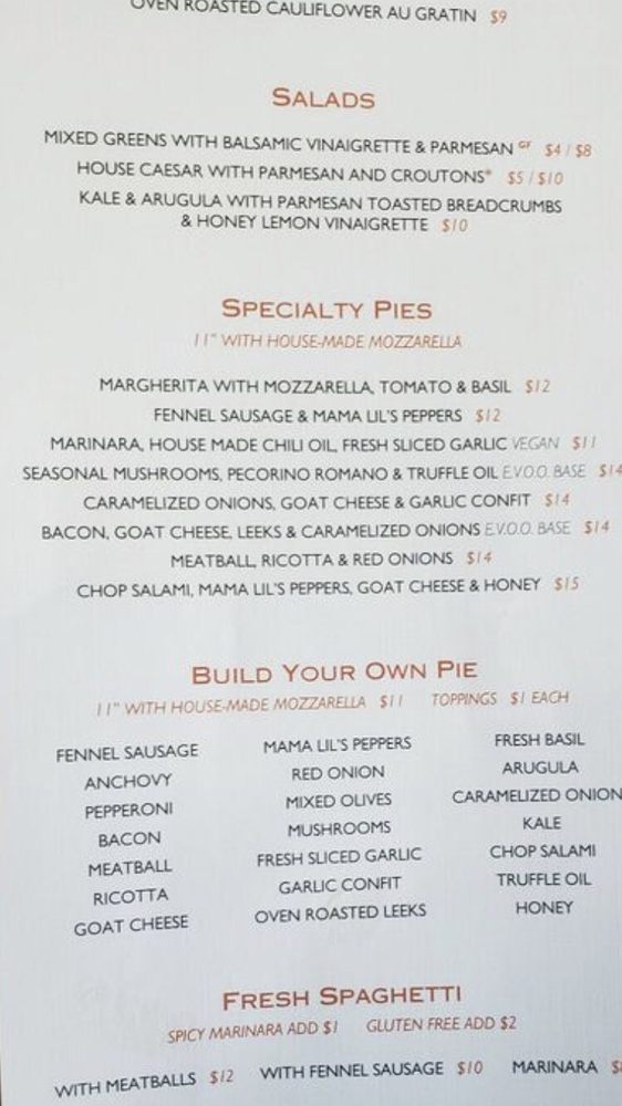 Salami, Mama Lil's, Goat Cheese & Honey on tomato sauce base with house made mozzarella, and parm